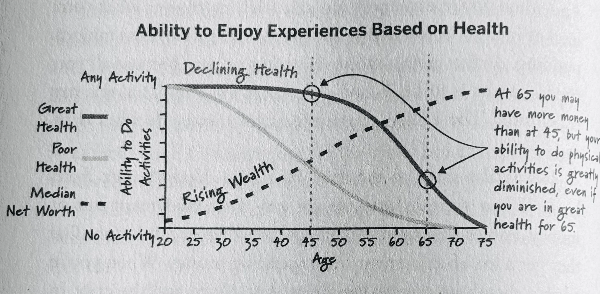 Referencing the graphic from the book, when we’re young, pre-marriage, pre-kids, we have ample amounts of time but no money. As we age and become more committed to our family, work, or community, we build wealth but lose time. All the while, our physical health remains strong while we work, provide, and save, until eventually we start to lose the capability to experience all we’ve been saving for.